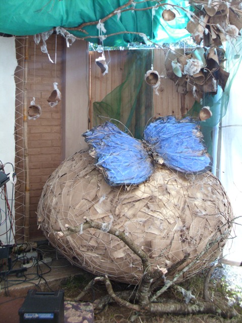 O enorme casulo da borboleta azul foi feito com a baínha do bambu. Troncos, cabaças, tudo se utiliza nesse festival de criatividade.